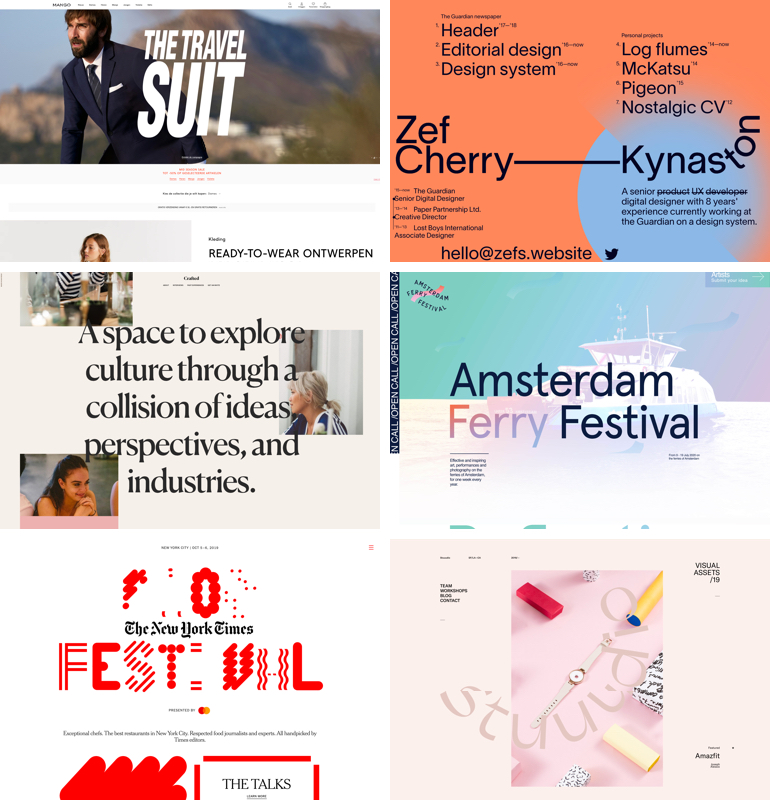 Design met een groots gebaar: enorme foto’s, vrolijke uitlijning, gigantische kopteksten in creatieve fonts. Geen pagina-gepriegel in een smal grid, maar opmaak tot ver voorbij de randen van het scherm, hoe groot ook. Met de mobile-first ontwikkelingen van de laatste jaren leek desktop totally uncool geworden. Maar we zien een herwaardering voor fors & flink: een website als dure modeglossy of coffee-table art book. Maar dan met animaties: het zoeft, glijdt en bubbelt. Zelfs tekst doet mee: kinetische typografie – woorden die rennen, springen, huppelen en dansen.