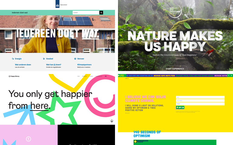 We noemen een paar voorbeelden. De BBC stelt: “Nature makes us happy”. Happy Money – voor sparen en tegen consumptief krediet – roept: “You’ll only get happier from here.” The Climate Optimist gelooft erin: “I believe we can solve climate change.” En zelfs biermerk Carlsberg gaat voor duurzaamheid: “We brew to create a better future for all of us.”